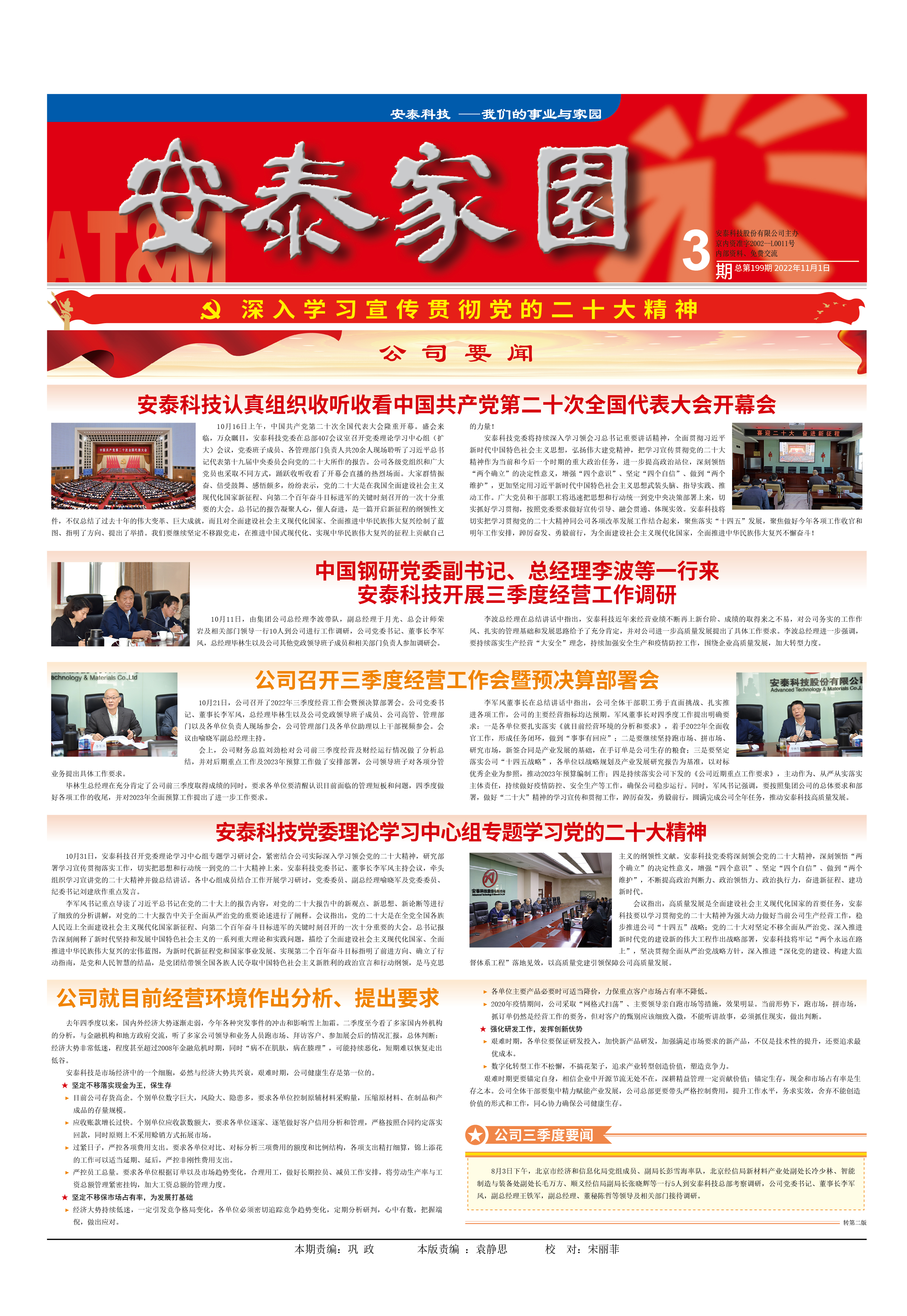 10月16日上午,中国共产党第二十次全国代表大会隆重开幕。盛会来临,万众瞩目,安泰科技党委在总部407会议室召开党委理论学习中心组(扩大)会议,党委班子成员、各管理部门负责人共20余人现场聆听了习近平总书记代表第十九届中央委员会向党的二十大所作的报告。公司各级党组织和广大党员也采取不同方式,踊跃收听收看了开幕会直播的热烈场面。大家群情振奋、倍受鼓舞、感悟颇多,纷纷表示,党的二十大是在我国全面建设社会主义现代化国家新征程、向第二个百年奋斗目标进军的关键时刻召开的一次十分重要的大会。总书记的报告凝聚人心,催人奋进,是一篇开启新征程的纲领性文件,不仅总结了过去十年的伟大变革、巨大成就,而且对全面建设社会主义现代化国家、全面推进中华民族伟大复兴绘制了蓝图、指明了方向、提出了举措。我们要继续坚定不移跟党走,在推进中国式现代化、实现中华民族伟大复兴的征程上贡献自己的力量!