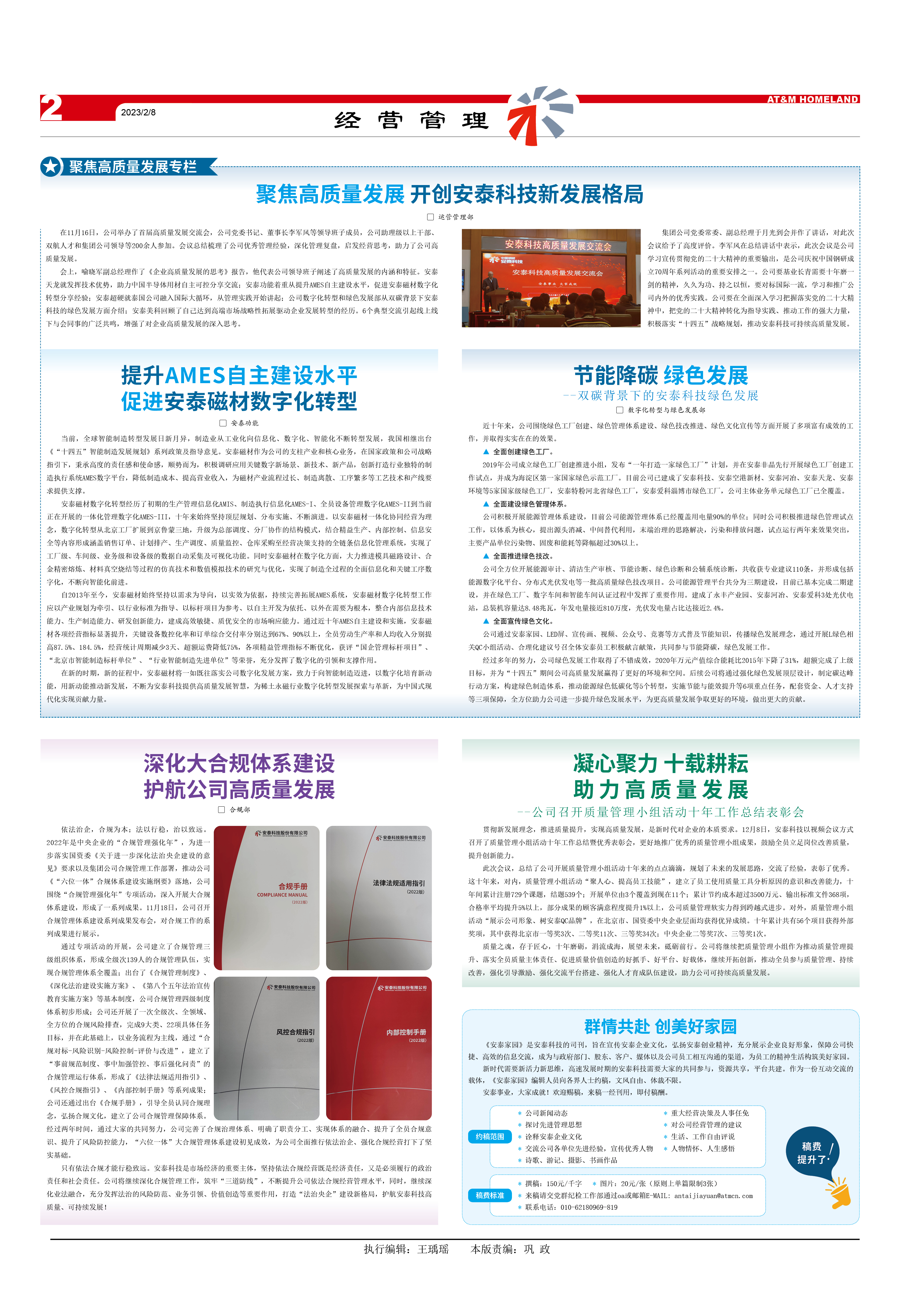 会上,喻晓军副总经理作了《企业高质量发展的思考》报告,他代表公司领导班子阐述了高质量发展的内涵和特征。安泰天龙就发挥技术优势,助力中国半导体用材自主可控分享交流;安泰功能着重从提升AMES自主建设水平,促进安泰磁材数字化转型分享经验;安泰超硬就泰国公司融入国际大循环,从管理实践开始讲起;公司数字化转型和绿色发展部从双碳背景下安泰科技的绿色发展方面介绍;安泰美科回顾了自己达到高端市场战略性拓展驱动企业发展转型的经历。6个典型交流引起线上线下与会同事的广泛共鸣,增强了对企业高质量发展的深入思考。