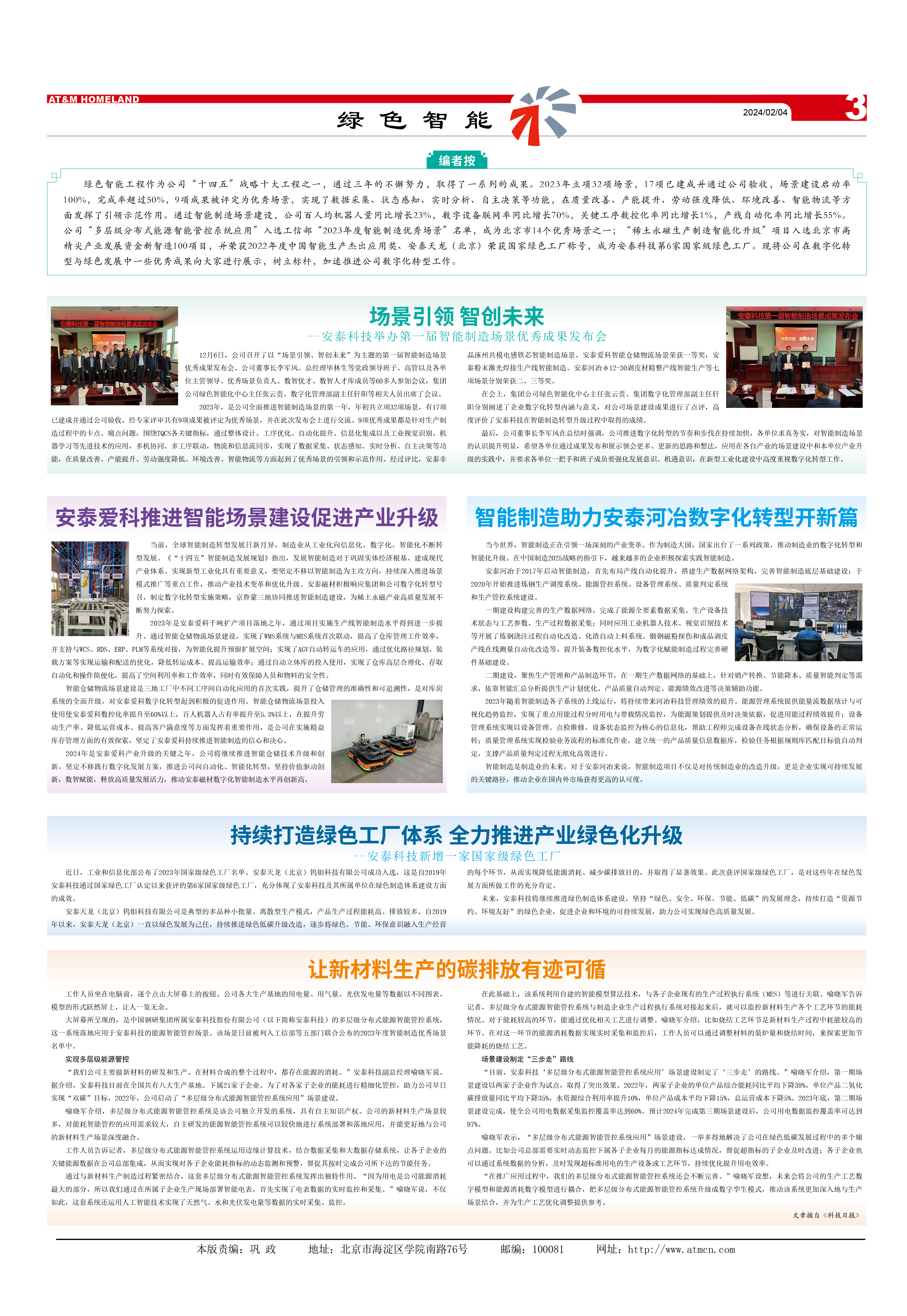 绿色智能工程作为公司“十四五”战略十大工程之一,通过三年的不懈努力,取得了一系列的成果。2023年立项32项场景,17项已建成并通过公司验收,场景建设启动率100%,完成率超过50%,9项成果被评定为优秀场景,实现了数据采集、状态感知、实时分析、自主决策等功能,在质量改善、产能提升、劳动强度降低、环境改善、智能物流等方面发挥了引领示范作用。通过智能制造场景建设,公司百人均机器人量同比增长23%,数字设备联网率同比增长70%,关键工序数控化率同比增长1%,产线自动化率同比增长55%。公司“多层级分布式能源智能管控系统应用”入选工信部“2023年度智能制造优秀场景”名单,成为北京市14个优秀场景之一;“稀土永磁生产制造智能化升级”项目入选北京市高精尖产业发展资金新智造100项目,并荣获2022年度中国智能生产杰出应用奖、安泰天龙(北京)荣获国家绿色工厂称号,成为安泰科技第6家国家级绿色工厂。现将公司在数字化转型与绿色发展中一些优秀成果向大家进行展示,树立标杆,加速推进公司数字化转型工作。
